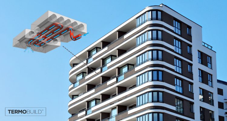 A ‘structural thermal energy storage’ is the key design element. The concrete floor easily absorbs and radiates heat and coolness. The concrete floor slab has a hollow core for air flow. Couple this structural thermal energy storage with sensors, energy harvesting, air ventilation keyed to outdoor temperatures, and air-driven radiant heating and cooling, and you have the beginning of the Termobuild system.